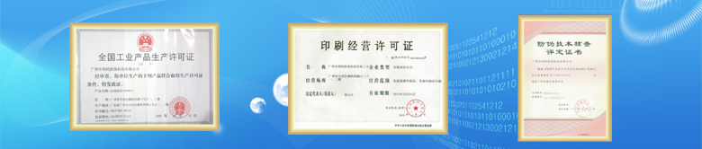 按照相关行业要求,我司已在北京通过严格的防伪码查询系统核查评审,荣获《防伪技术评审合格证书》,经新闻出版局实地考察和严格评审,荣获《印刷许可证》;经质检总局实地考察严格评审,荣获《防伪标签生产许可证》。